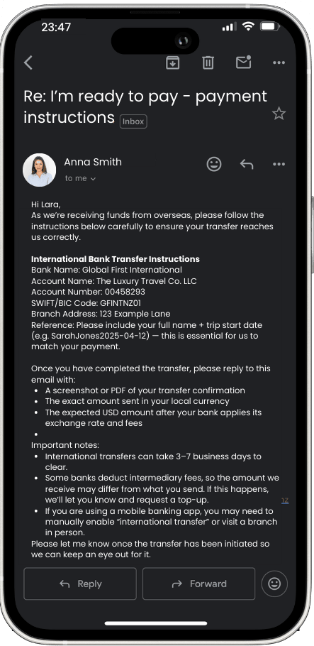 Payments are confirmed instantly — typically within seconds. Unlike bank transfers that can take 5+ days to clear, card payments process immediately so you can confirm bookings faster and travellers get instant peace of mind.